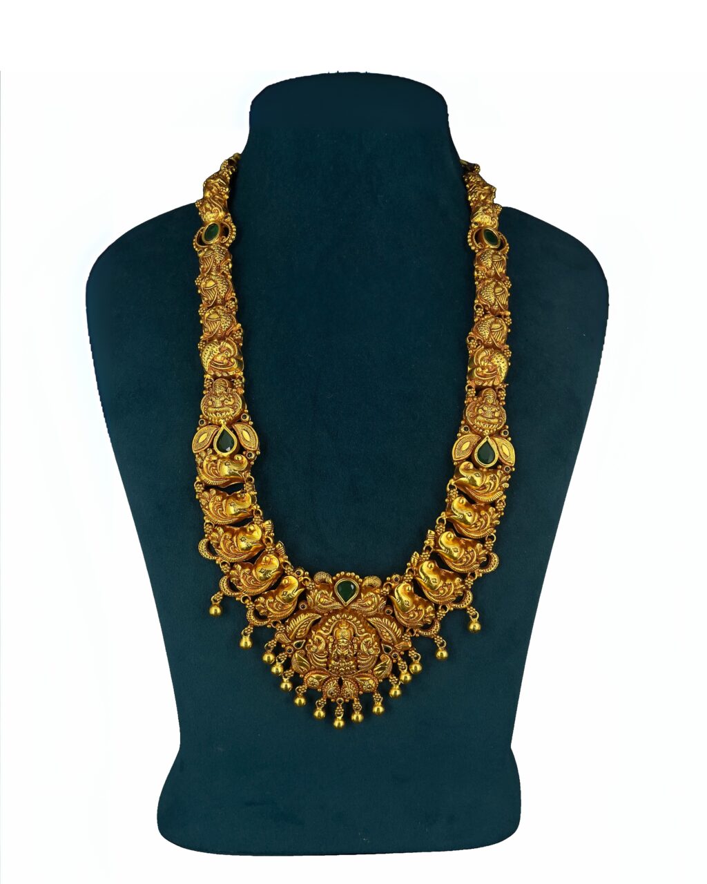 Step into the elegance of tradition with this Peacock Lakshmi Temple Long Haram, masterfully handcrafted in 92.5 pure silver and finished with a radiant gold polish. The central pendant showcases Goddess Lakshmi seated on a lotus, flanked by graceful peacock motifs, symbolizing beauty, prosperity, and grace. The chain features alternating peacock and floral motifs accented with green stones, enhancing its regal appeal. Dangling bead drops add charm and movement, making it a statement piece for weddings, bridal wear, and festive occasions.