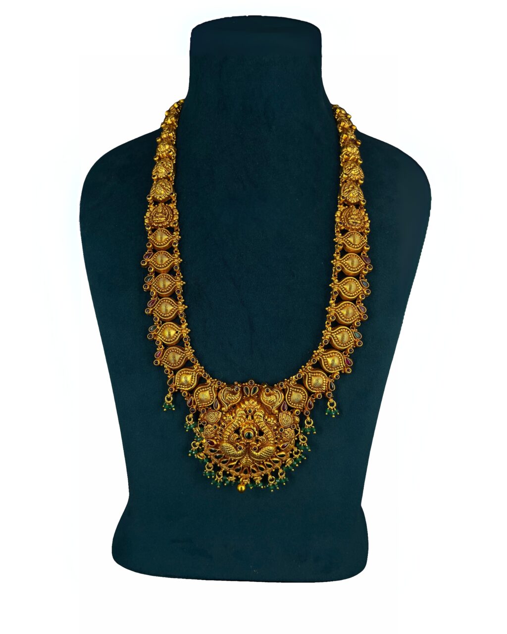 Celebrate timeless tradition with this Lakshmi Peacock Antique Temple Long Haram, exquisitely handcrafted in 92.5 pure silver and adorned with a rich gold polish. The grand pendant features Goddess Lakshmi seated on a lotus, flanked by peacocks, symbolizing prosperity, grace, and blessings. The chain showcases detailed paisley and floral motifs embellished with red and green stone accents, while the dangling bead drops add a graceful touch. Perfect for weddings, bridal wear, and festive occasions, this haram exudes heritage elegance.
